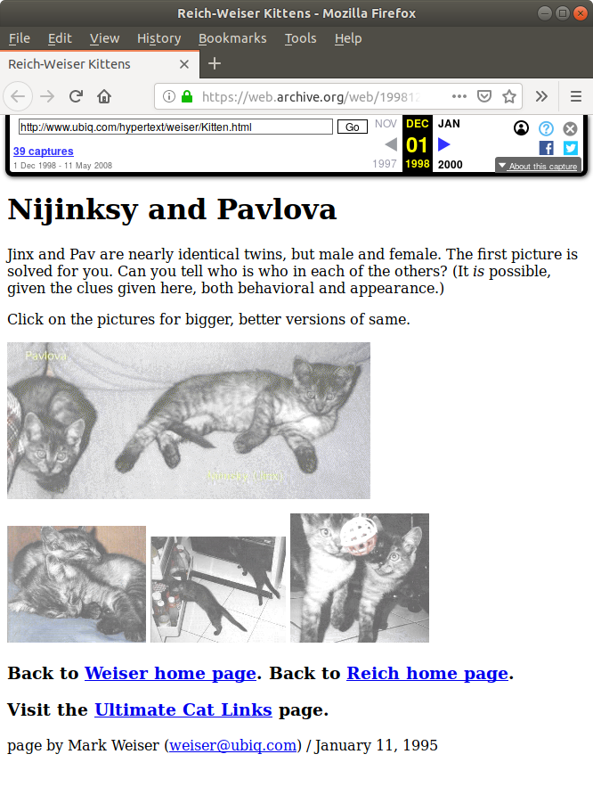 If the range displayed is small, it is likely that the page is "temporally coherent" in the terminology of Nelson and his co-authors. They have done significant work in this area, for example Only One Out of Five Archived Web Pages Existed as Presented. A large range, as in the case of Nijinski and Pavlova's home page, does not necessarily indicate that the page is "temporally incoherent". The cats home page is in fact correctly rendered. But it does suggest some caution in accepting the replayed page as evidence.