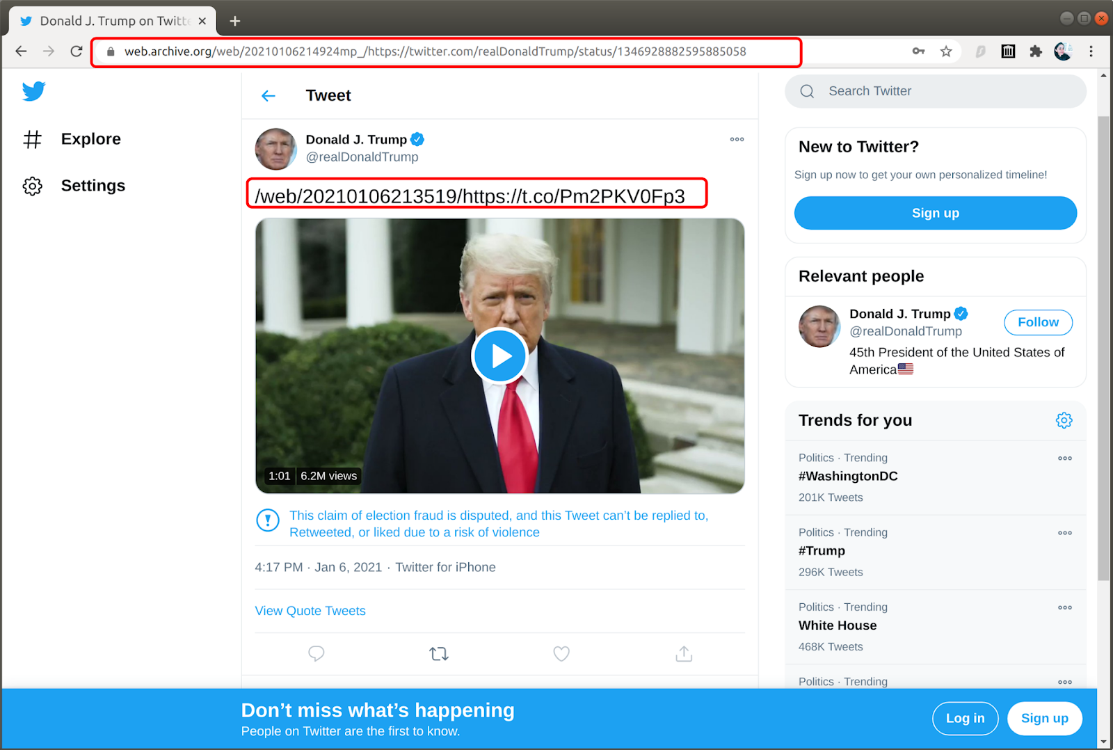 The URL gets rewritten at the server-side by Wayback Machine when the full-text value contains only a URL. However, note that only “/web/20200916204909/https://t.co/BS5JAFqReH” is displayed in the tweet with "https://web.archive.org" stripped off of the URI-M (Figure 4). ... The length of a t.co URL is 23 characters and is a fixed value that will rarely change. Therefore, Twitter's JavaScript is removing only the first 23 characters from the much longer t.co URI-M. It just happens that the string length of "https://www.archive.org" is also exactly 23 characters.The Wayback Machine has a problem. Consider this snippet of HTML: